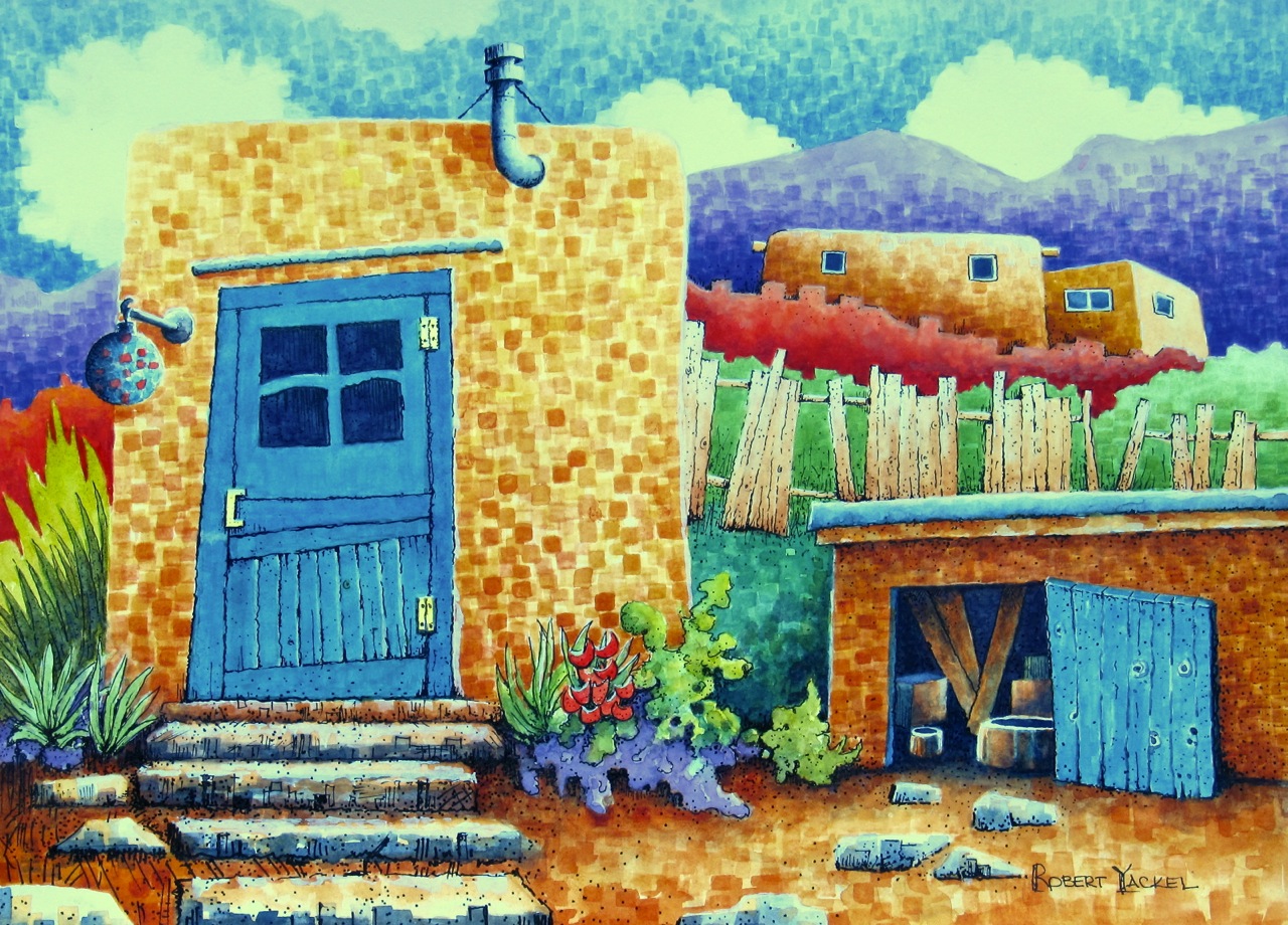 Bob revisited the adobe studio of Doel Reed (1894 – 1985) for his latest watercolor. Reed was a master printmaker and an important member of the Taos art community after his retirement as head of the Oklahoma State University art department in 1959. While taking a Stephen Kilborn workshop a few summers ago Bob had the privilege of visiting the Reed property. This is the third rendition he’s painted from his photographs and sketches.