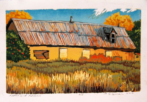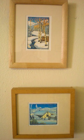 Many of Coleman’s subjects reflect her years of living in Taos, New Mexico and her love of hiking and camping in the mountains ofColorado and New Mexico. We’ve collected a number of her works over the last ten years. Each day we enjoy Coleman’s images of chamisa, golden aspen, antique truck and rustic adobes in our home. Add to that today’s purchases of two winter scene miniatures and her last available print of Apples and Adobes.